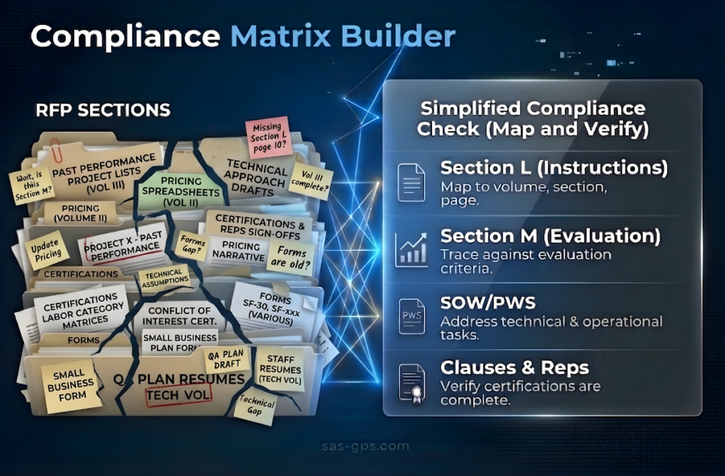 - RFP release: Build the initial compliance matrix from Sections L and M and the SOW/PWS.